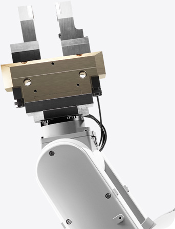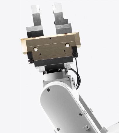 Een hand met een iPhone 12 met stickers. Robotarm voor Daisy, de recyclingrobot van Apple.
