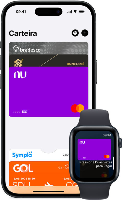 Configure em segundos no seu iPhone. O Apple Pay está integrado ao iPhone, Apple Watch, Mac e iPad. Para começar no iPhone, abra o app Carteira e toque no símbolo de mais. Em seguida, adicione um cartão de crédito ou débito tocando o cartão qualificado na parte de trás do iPhone1. Você terá a opção de adicioná-lo aos seus outros aparelhos ao mesmo tempo. Para pagar, clique duas vezes, toque e pronto. Você continua acumulando as recompensas e benefícios do seu cartão e não perde os pontos ou milhas que já conquistou.