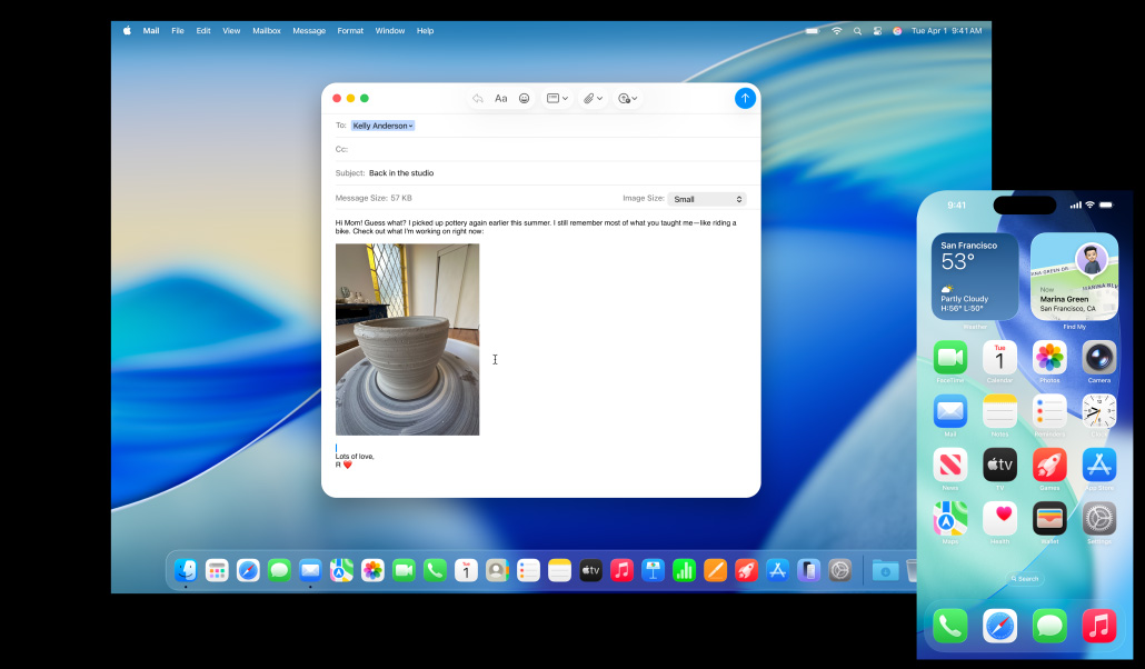 iPhone Mirroring lets you see and use your iPhone right from your Mac.5 So even if your phone is getting charged across the room, you can still access all your favourite iPhone apps. Live Activities from your iPhone also appear on your Mac. So when timely events occur — like when your Uber arrives — you don’t have to reach for your phone to stay in the know. You can even drag and drop a video from your Mac to your iPhone, so you can continue editing on the go.