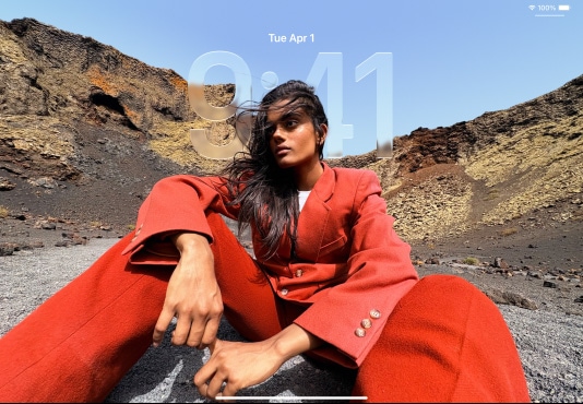 Prozkoumat iPad iPad a iPad Air vedle sebe, iPad Air v popředí překrývá iPad, orientace na výšku, na zamknuté obrazovce jsou v průhledném Liquid Glass designu zobrazené hodiny