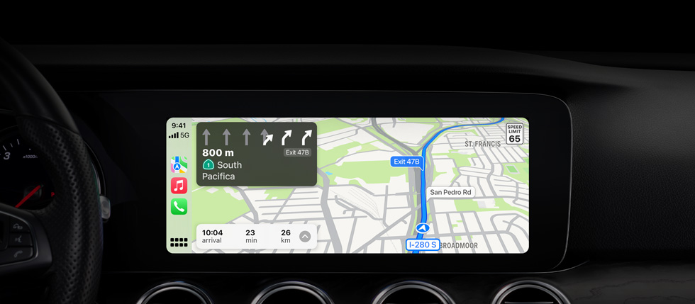 CarPlay brings the power and simplicity of Maps behind the wheel. It can make intelligent suggestions based on data you already store on your device, like addresses from your email, text messages, contacts, and calendars. And with a detailed map and turn‑by‑turn spoken directions, it’s easier than ever to get where you need to go.