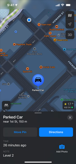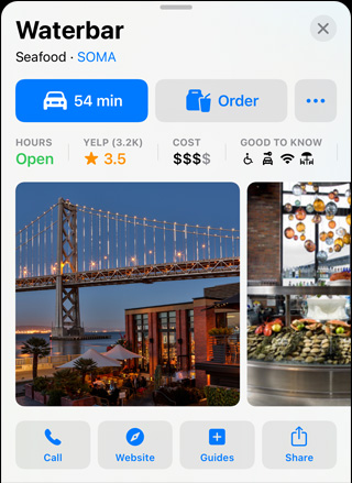 Choose a destination, and its interactive place card shows you everything you need at a glance. See basics like address, hours, website, and phone number, along with details like price range, photo galleries, associated Guides, accepted payment types — even whether you can bring your dog. Launch Flyover or Look Around to get a sense of the location and surroundings. You can even quickly and securely rent a bike, pay for parking, order food, and more with just a tap.