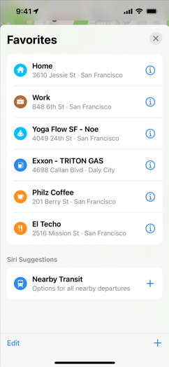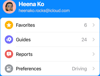 Open Maps and tap your user account photo at the bottom of the screen to see your most used settings — like preferred mode of transit, reported issues, and favorites — all in one place. And when you open Maps on your devices or on your dashboard with CarPlay, it displays the places you visit most — so you’re always just a tap away from home, work, the gym, your kid’s school, the nearest gas station, or your favorite restaurant.