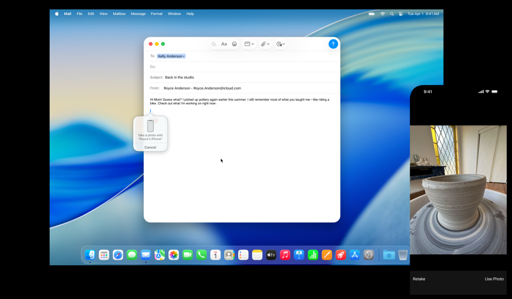 Mac, iPhone, iPad, dan Apple Watch luar biasa saat bekerja sendiri. Dan semakin mengagumkan saat digunakan bersama. Berkat Kontinuitas, perangkat Anda bekerja sama dengan mulus — memungkinkan berbagai fitur yang andal. Mulai email di Mac dan selesaikan di iPad Anda. Ambil foto di iPhone dan lihat foto itu muncul di Mac Anda. Atau lakukan panggilan tanpa menyentuh iPhone Anda.1 Nikmati keajaiban Kontinuitas.
